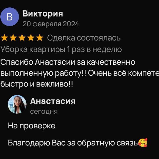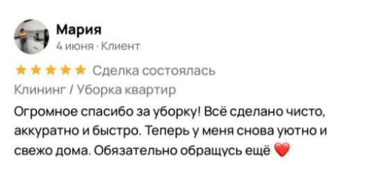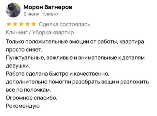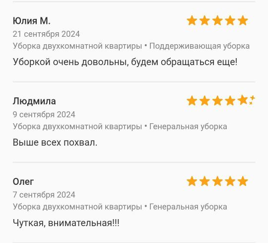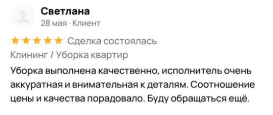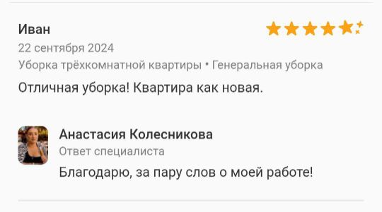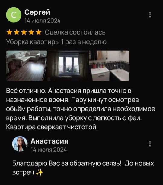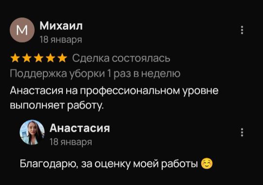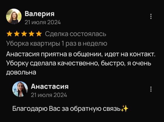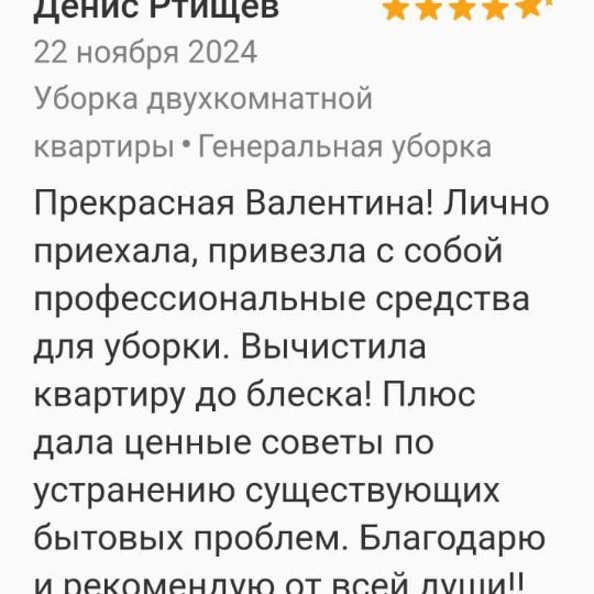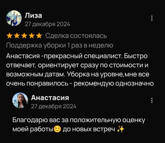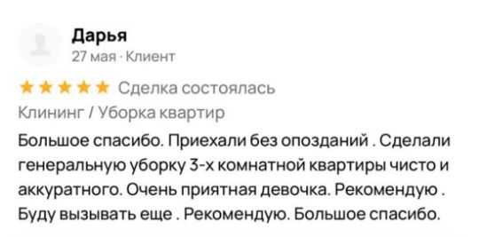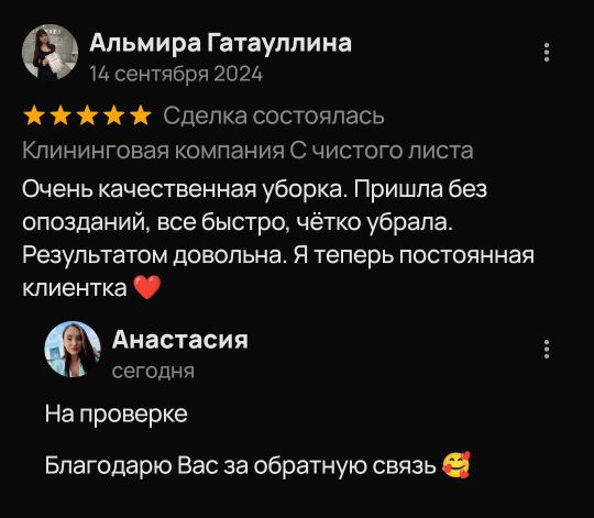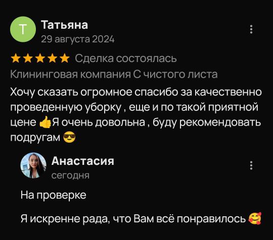 История компании начинает свой отсчёт с 2022года, все это время до сегодняшнего дня я работала как самозанятая, присматривалась к клинерам различной категории от новичков до профессионалов, разработала свою стратегию качественной уборки для Вас! Для меня как и для Вас важно чтобы работа была выполнена КАЧЕСТВЕННО и ДОБРОСОВЕСТНО! Имея за плечами 12-ти летний опыт работы С КЛИЕНТАМИ, я ответственно отношусь к заказам, не люблю подводить людей! В первую очередь, Вам важно знать, что Ваш заказ будет выполнять ПРОФЕССИОНАЛЬНЫЙ КЛИНЕР который хорошенько намоет каждый уголок в Вашем доме! В моей команде только опытные клинеры, в которых я уверена как в себе! Во-вторых наша команда хорошо владеет ВРЕМЕНЕМ — вовремя приедут, правильно оценят время работы, и вовремя уедут не задержав Вас! Работа будет выполнена на все 100%! После себя обязательно оставят ЧИСТОТУ И УЮТ В ВАШЕМ ДОМЕ! А так же ОТЛИЧНОЕ ВПЕЧАТЛЕНИЕ о работе! Я работаю уже в данной сфере не первый год, У НАС НЕТ ВЫМЫШЛЕННЫХ ЦЕН, РАБОТАЕМ ПО ЧЕТКОМУ ПРАЙС ЛИСТУ! И ВЫДАЕМ ЧЕК/СЧЕТ ЗА УСЛУГУ а так же если требуется заключаем договор как с физ. лицами так и с юр.лицами.